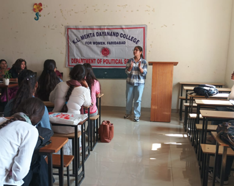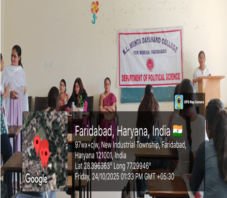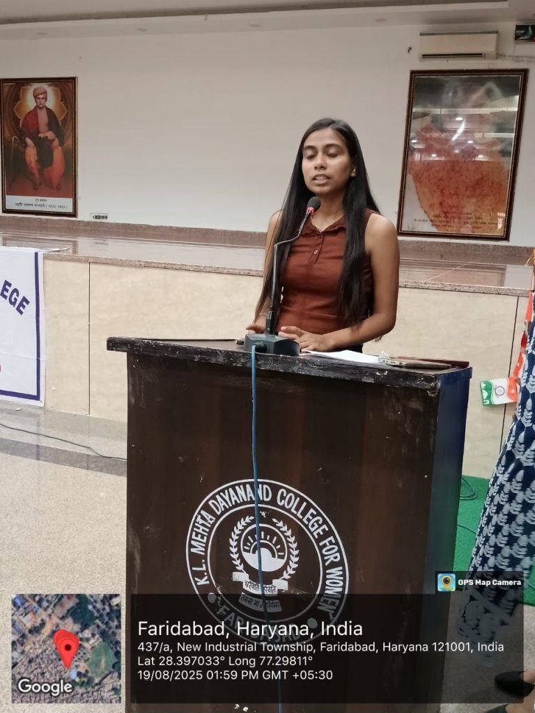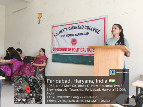 The Department of Political Science, *K.L. Mehta Dayanand College for Women, Faridabad*, under the *aegis of IQAC*, organized a Declamation Competition on the occasion of United Nations Day, 24 October 2025. The theme of the event was *“Reforming the UN Security Council: Why India Deserves a Permanent Seat?”* The event was *convened by Dr. Madhurima Dubey and Dr. Babita Singh*, while the judging panel included Dr. Babita Sharma from the *Department of English* and *Dr. Pooja Tyagi* from the *Department of Hindi*, whose insightful evaluation and encouragement added academic depth to the competition. The competition witnessed enthusiastic participation from students who eloquently presented their views on India’s role in global governance and the urgent need for structural reforms in the United Nations. After a series of impressive speeches, *Himanshi (M.A. Political Science, Final Year)* secured the *First Position*, *Isha (B.A. Third Year)* won the *Second Position*, and *Tannu Awana (M.A. Political Science)* stood *Third*, while a *Consolation Prize* was awarded to *Devi Smita (B.Com. Hons.)* for her commendable performance. The event was graced by the Hon’ble Principal, Dr. Meenu Dua, whose presence encouraged the participants and added prestige to the occasion. Other attendees included *Dr. Veenapani Singh*, *Ms. Diksha Chawla*, *Ms. Madhu Rathi*, *Ms. Sakshi*, *Ms. Diksha*, and *Ms. Tanshul*. The programme concluded with the *National Anthem*, marking a dignified end to a meaningful academic exercise that enriched students’ understanding of a significant global issue.