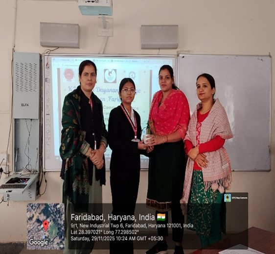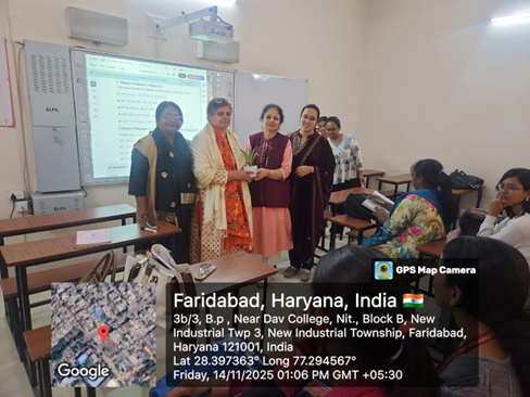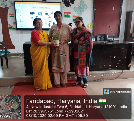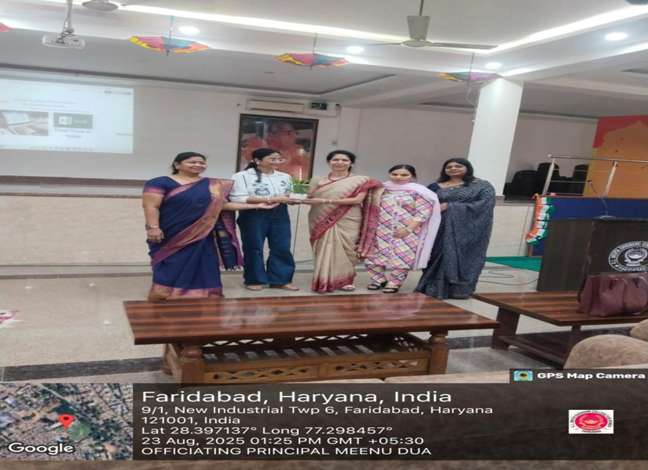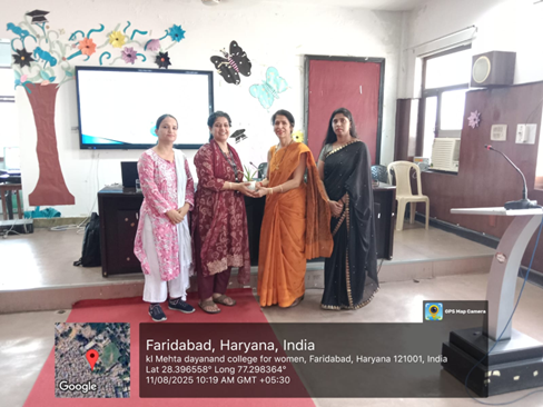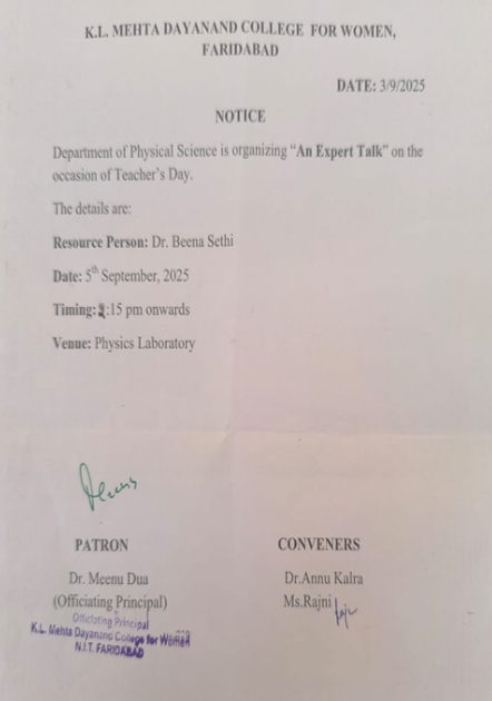 5th September 2025 The *Department of Physical Science*, K.L. Mehta Dayanand College for Women, Faridabad organized an *Expert Talk* to mark the occasion of *Teacher’s Day on 5th September 2025* in the Physics Laboratory. The program commenced with the warm welcome of Principal ma’am, *Dr. Meenu Dua*, with a sapling, presented by *Dr. Beena Sethi* (HOD Science) along with other faculty members. Principal ma’am also delivered an inspiring speech, highlighting the invaluable role of teachers in shaping young minds and encouraging students to follow the path of discipline, dedication, and knowledge.The event was anchored by Ms. Anita, who conducted the program with great enthusiasm and ensured its smooth flow.This was followed by an insightful session by Dr. Beena Sethi, who emphasized the importance of teachers in building character and values. She explained the essence of the *first chapter of the Bhagavad Gita*, relating its teachings to real-life situations. She also introduced the college *alumni teachers* to the students, sharing their achievements and motivating the young learners to strive for excellence.Adding charm to the celebration, B.Sc. Physical Science students from 1st, 2nd, and 3rd year showcased their talents through *dance, songs, and a short play* dedicated to their teachers, which filled the atmosphere with joy and gratitude. The event saw enthusiastic participation from students and faculty members alike and concluded with a heartfelt vote of thanks. The celebration left everyone inspired, creating a memorable blend of respect, joy, and learning.