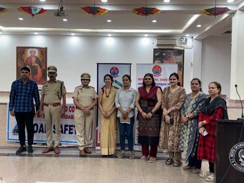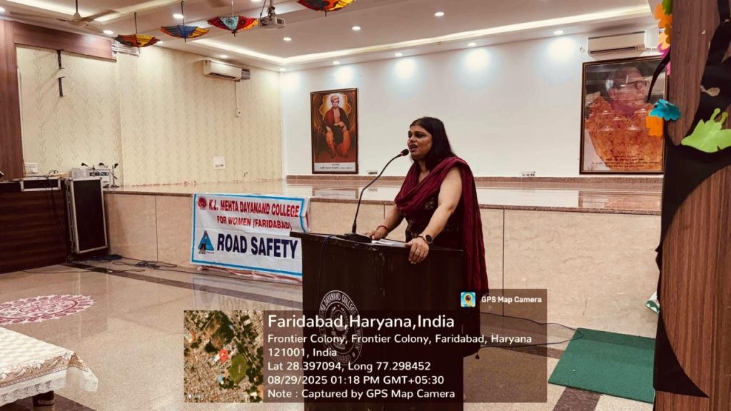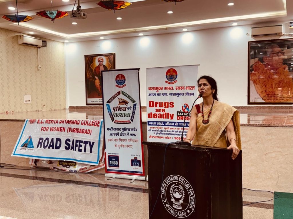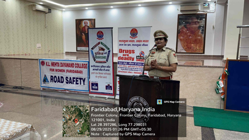 Awareness Program on Traffic Guidelines As per the orders of Hon’ble Director General of Police, Haryana and under the guidance of Police Commissioner Faridabad and Deputy Commissioner of Police Traffic, Road Safety Club of K.L.Mehta Dayanand College for Women, Faridabad in collaboration with Community Policing Cell organised an awareness program on “Traffic Guidelines” on 29th August 2025 at 1:00pm in auditorium aimed to create awareness among students regarding the use of traffic rules and guidelines. Ms. Sunita (Police Inspector), Mr. Manoj Kumar (Chowki incharge) explained to the students about traffic rules such as following signals, wearing seatbelts, obeying speed limits, and using zebra crossings are essential for road safety and prevention of accidents. Key rules include always stopping at a red light, driving on the left side of the road, maintaining a safe distance from other vehicles. To make the event successful, the efforts and cooperation of the Principal Mam Dr. Meenu Dua was highly commendable. Dr .Madhu Singh (Convener) and Ms. Rekha Barak and Ms.Komal Malhotra (Co-conveners) of the Road Safety Club were present there and made the program successful.