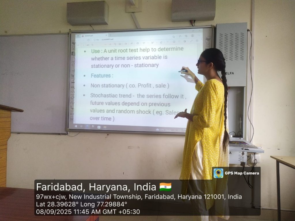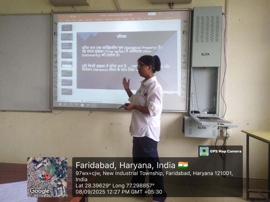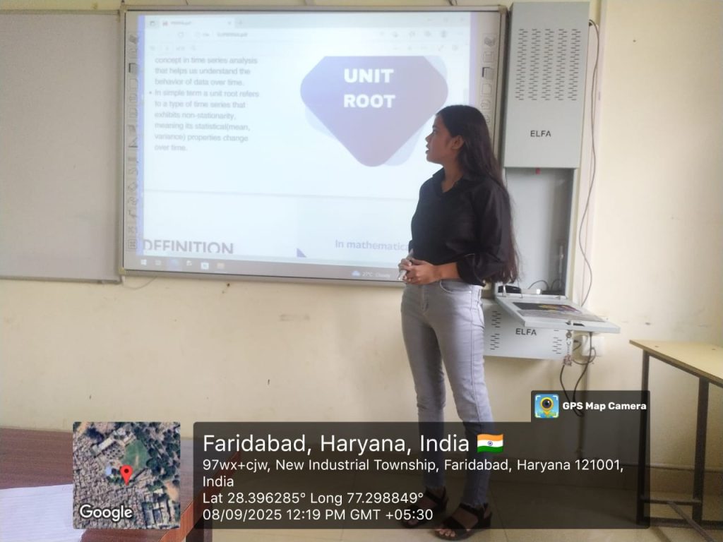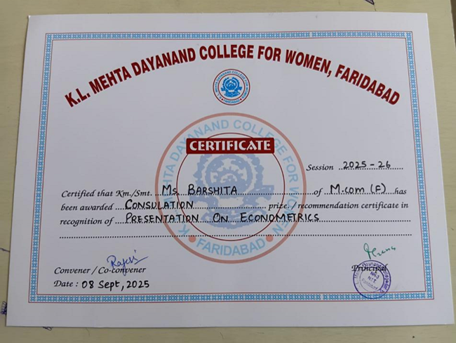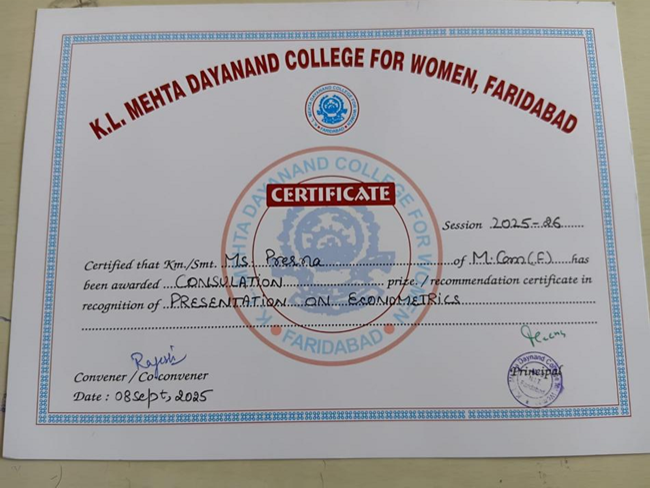 Power point presentation on Econometrics Power point presentation on Econometrics was organised by Department of Commerce and Management in Room No. 58 at K.L. Mehta Dayanand College for Women, Faridabad on 8th September 2025 for M.Com Final Year The presentation was conducted under the patronage of Dr. Meenu Dua (Officiating Principal) and guidance of Mrs. Amita Dureja (IQAC Coordinator). The event was convened by Dr. Rajesh Kumari and Dr. Rina Prasad, with Dr. Vandana as the Co-Convener. Topics Covered 1. Fundamentals of Econometrics 2. Stochastic Process 3. Unit Root The objective of the event was to enhance students’ understanding of econometric concepts through interactive presentations and to encourage them to develop analytical and presentation skill. Judges of the presentations were evaluated by: Dr. Rina Prasad Dr. Rajesh Kumari Results of the presentation: I Prize: Teena (Roll No. 05) – 09 Marks II Prize: Jaini Virmani (Roll No. 16) – 08 Marks II Prize: Jasmeet (Roll No. 11) – 08 Marks III Prize: Shruti Juyal (Roll No. 04) – 07 Marks Consolation Prizes: Barshita (Roll No. 01) – 06 Marks Breesna (Roll No. 14) – 06 Marks. The event proved to be an enriching experience for the students. They not only gained conceptual clarity but also developed confidence in public speaking and academic presentation. The judges appreciated the efforts of the participants and motivated them to continue exploring econometric applications in research and higher studies.