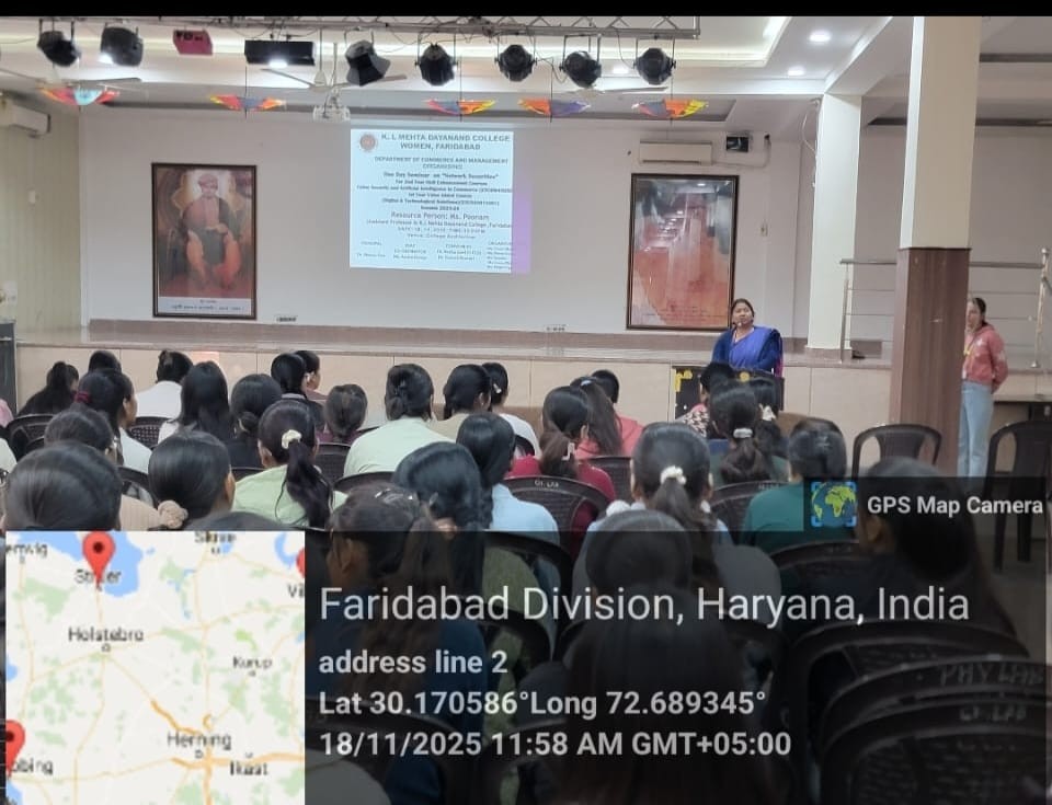 Date– 18.11.2025 Time – 12.00 pm Venue– College Auditorium Audience- More than 600 students Organized by: Department of Commerce & Management Patron: Dr. Meenu Dua(Officiating Principal) Convenor of the Program: Dr Rekha Goel, Dr. Sudesh Kumari IQAC Coordinator: Ms. Amita Dureja Ms. Poonam delivered an informative and engaging Seminar on Network Security, covering Cyber security and Artificial Intelligence. Here’s a report on the event: Key Highlights: 1. Importance of Network Security: Ms.Poonam emphasized the significance of network security in protecting data and systems from cyber threats. 2. Types of Cyber Attacks: She discussed various types of cyber-attacks, including phishing, malware, and ransom ware, highlighting their impact on individuals and organizations.