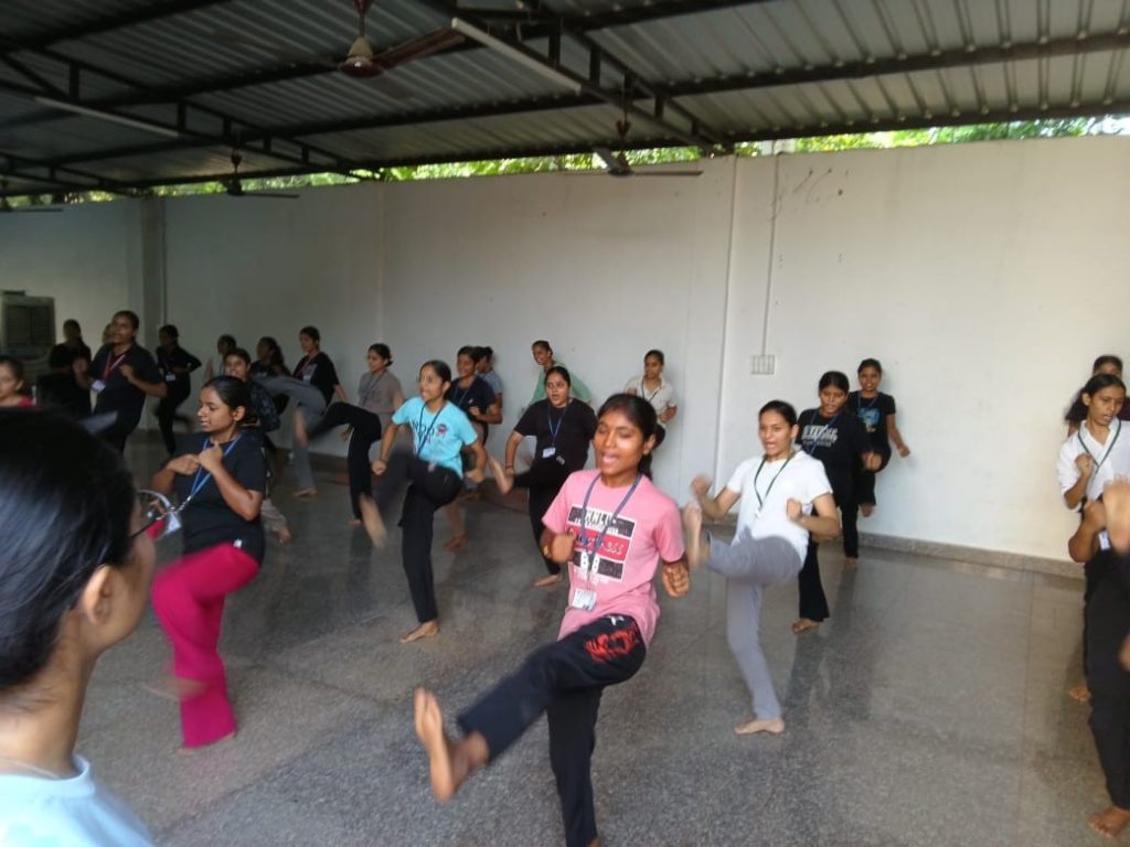 On 5th day of workshop, Coach Ms. Madhuri Shukla, started the camp with a warm-up session followed by Slow jump, High jump, Running, Defence Block, Defence Punch, Push Kick, Defence card swipe, Streching , Streching push ups, Punch and hit kick and last but not the least learnt to be alert and active every time. Approx. 65 students of women Cell attended the workshop. The event was coordinated by the convener Ms. Madhu Saitya and co- conveners Dr. Babita Singh and Ms. Komal Malhotra. Office Bearers of Women Cell organised the event successfully.