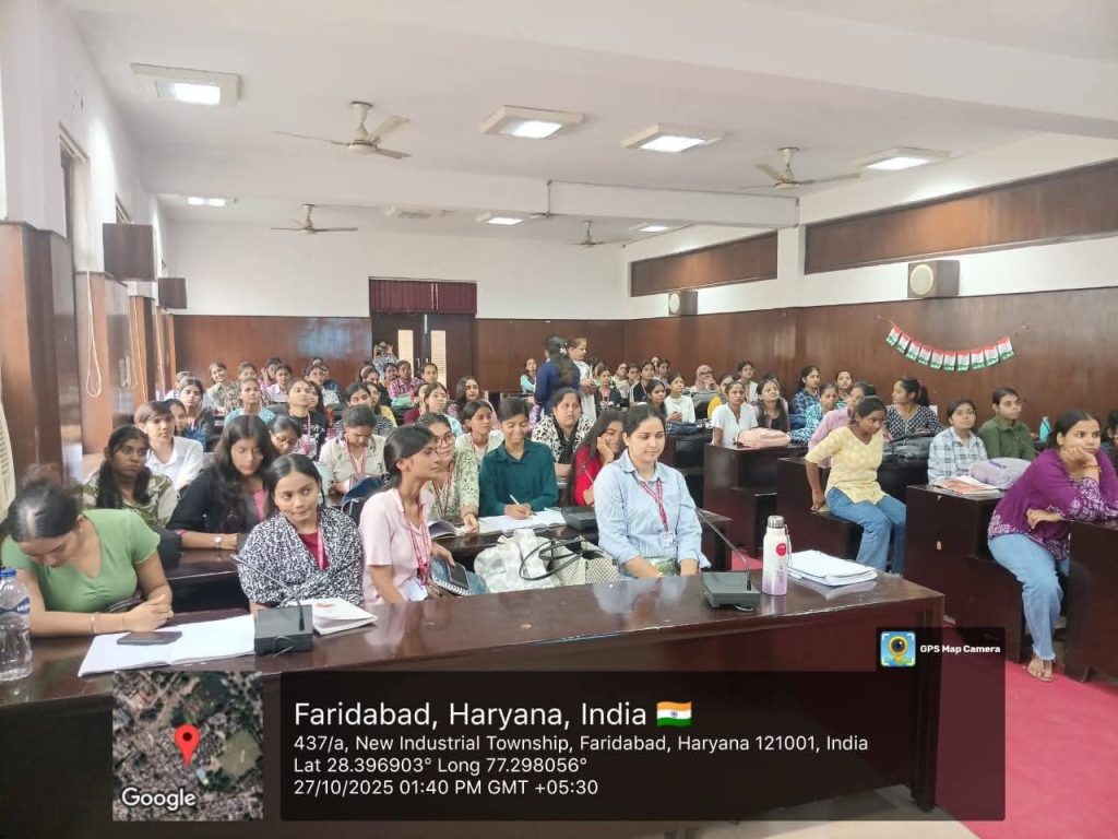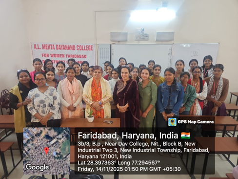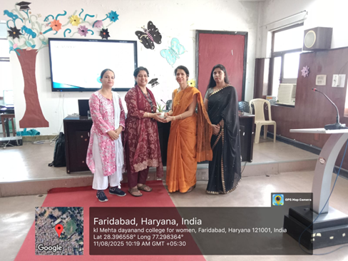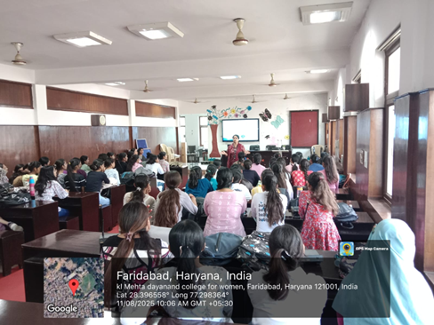 K.L. Mehta Dayanand College for Women, Faridabad, under its Legal Literacy Cell and IQAC, organized an Expert Talk on “Mental Health Awareness and Prevention of Student’s Suicide in Higher Education Institutions” on 29th August 2025, in compliance with the directions of the Department of Higher Education, Haryana.The programme began with the lamp lighting ceremony, symbolizing knowledge and awareness. Principal Dr. Meenu Dua welcomed the guest, Advocate Manmeet Kaur, with a sapling and also addressed the students.The programme witnessed the gracious presence of faculty members including Dr. Miltlesh Agrawal (HOD, Arts), Dr. Madhurima Dubey, Dr. Veena Pani Singh, Dr. Babita Singh, Dr. Madhu Rathi, Ms. Diksha Chawla, Ms. Sakshi, and Ms. Diksha, whose participation added academic value to the event.In her address, Advocate Manmeet Kaur highlighted the major causes of mental stress among students, emphasized preventive strategies, and explained the legal responsibilities of higher education institutions in safeguarding student well-being. The deliberation encouraged students to share their concerns, raise queries, and reflect on practical solutions, making the session highly interactive and engaging.The discussion not only deepened awareness about mental health challenges but also underlined the importance of legal and institutional frameworks in addressing them. Overall, the Expert Talk proved to be an academically enriching initiative that strengthened sensitivity towards mental health within the campus environment.The programme concluded with the National Anthem, marking a dignified closure to the event.