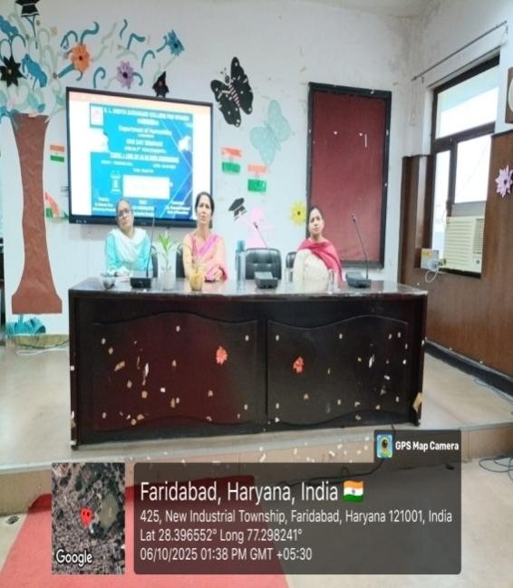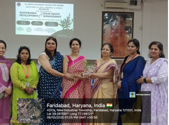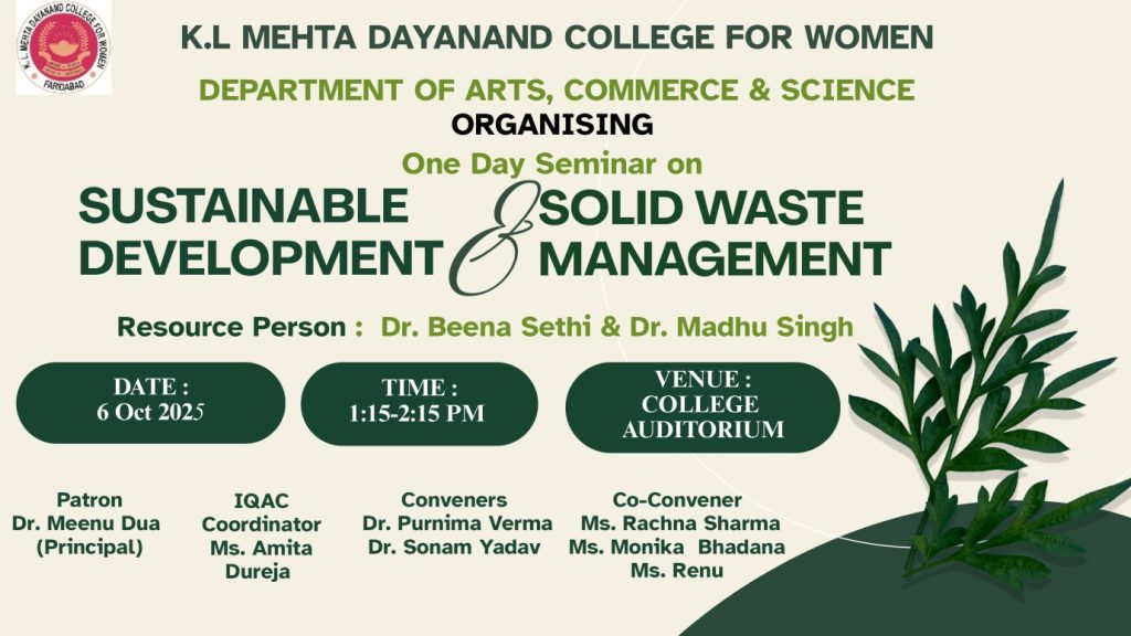Date– 06-10-2025 Time – 1:15 – 2:15 pm Venue- College Auditorium Organized by: Department of Arts, Commerce & Science Patron:Dr. Meenu Dua IQAC Coordinator: Ms. Amita Dureja Resource person- Dr. Beena Sethi,Dr. Madhu Singh Convenor : Dr.Purnima Verma, Dr. Sonam Yadav Co- convener:Ms.Rachna sharma Ms. Monika Bhadana Ms. Renu Kumari The seminar begin with a keynote address by Dr. Beena Sethi discussed critical issues such as urban waste generation, plastic pollution, recycling, composting, and the role of public participation in waste management. Dr. Madhu Singh who highlighted the importance of sustainable development in ensuring a balance between economic growth and environmental protection. Participants actively engaged in discussions and shared their ideas on promoting sustainability at individual and community level. The event successfully increased awareness and encouraged responsible behavior towards the environment, contributing to the broader goal of sustainable development.levels.The seminar concluded with a vote of thanks by Dr. Neha Jain and a pledge by all attendees to adopt eco-friendly practices in their daily lives. Around 700 students actively attended the seminar along with teachers and experts. Principal Dr. Meenu Dua Ma’am appreciated the efforts of the Department, the Convenors, and the esteemed Resource Person for organizing such an impactful session.