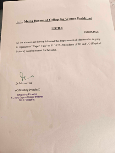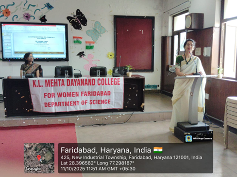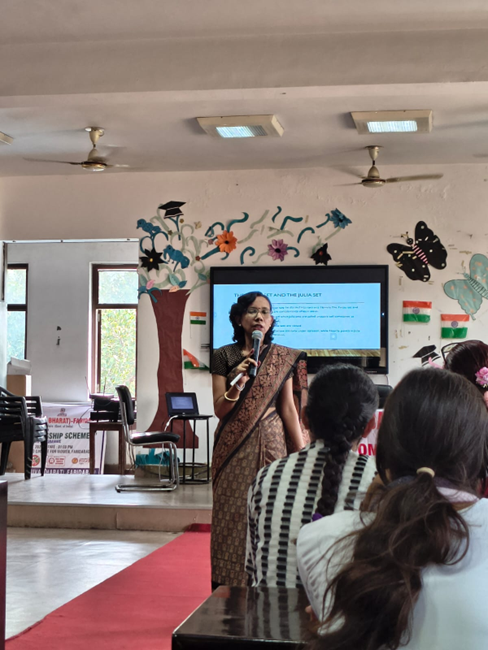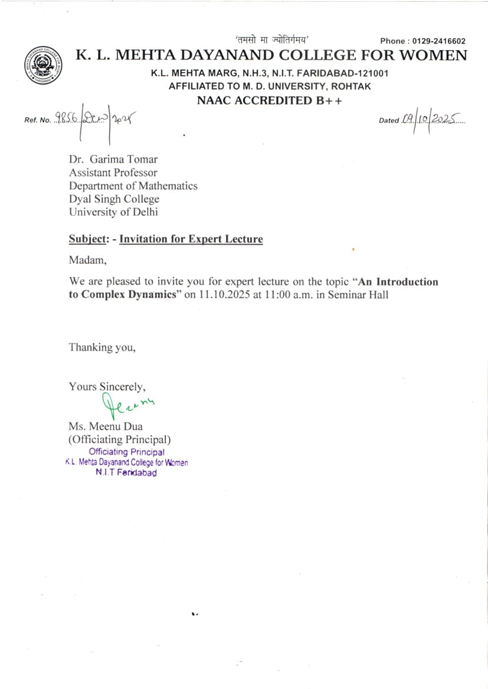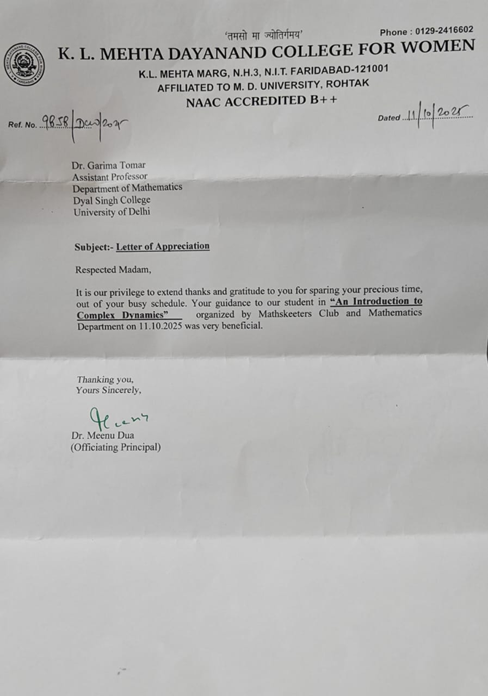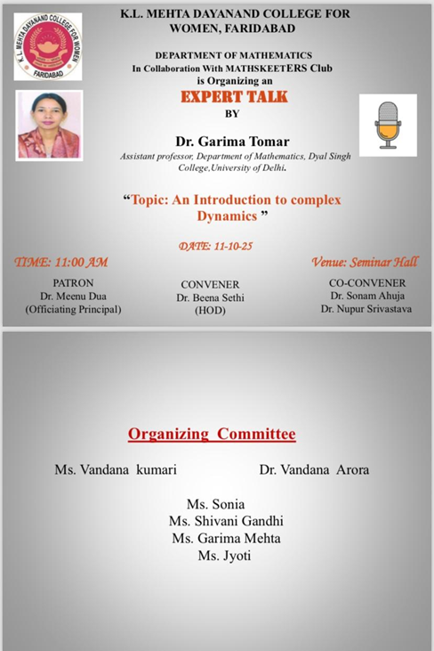 *Introduction* Department of Mathematics in collaboration with Mathskeeters Club Organized an “Expert Talk” By *Dr. Garima Tomar* Assistant Professor, Department of Mathematics, Dayal Sing College, *University of Delhi* on the topic *”An Intoduction to Complex Dynamics”* on 11th October 2025 in K.L. Mehta Dayanand College, Faridabad.The objective of Lecture was to enhance understanding and appreciation of the subject among students. *Proceedings of the Event* The Session was commenced with a warm welcome address by Dr. Sonam Ahuja, who introduced Dr. Garima Tomar & her significant contributions to the field of Complex Dynamics. Our Principal Dr. Meenu Dua & Resource Person Dr. Garima Tomar was welcomed with a sapling by the Department of Mathematics as a token of gratitude. *Lecture Overview:* Dr. Garima’s talk was structured as a journey from simple concepts to complex,mesmerizing outcomes. She covered various Topics of Complex Dynamics through her Presentation some of them are stated below: