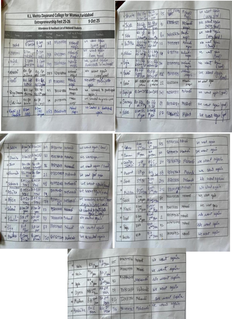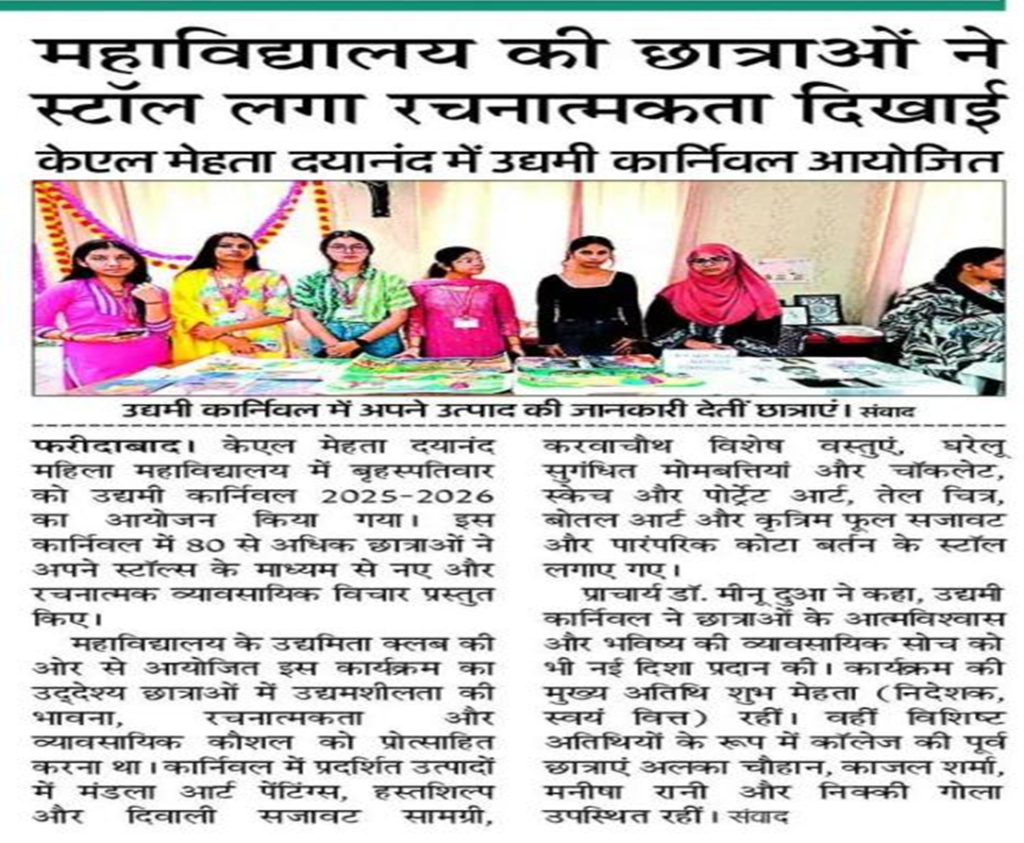 Highlight of the Event :- Entrepreneur Carnival 2025–2026 “Don’t just watch, be a part of it, because no carnival is complete without you.” Organized by: Entrepreneurship Club, K.L. Mehta Dayanand College for Women, Faridabad Date: 9th October 2025 Venue: College Auditorium Time: 12:30 P.M. The Entrepreneurship Club of K.L. Mehta Dayanand College for Women, Faridabad, under the aegis of the Institution’s Innovation Council (Ministry of HRD Initiative), organized the Entrepreneur Carnival 2025–2026 on 9th October 2025 in the College Auditorium. The event aimed to foster entrepreneurial spirit among students by showcasing innovative products, homemade crafts, and creative business ideas. Chief Guest & Guests of Honour Chief Guest: Ms. Shubh Mehta (Director, Self Finance)