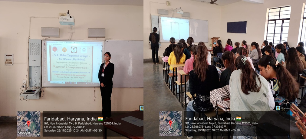 The Department of Computer Science organized an Session on the topic “Session on Achieving Problem Solving Fit”(Theme: Innovation and Entrepreneurship) on 29th Nov 2025 to guide students in validating their identified problems and aligning them with practical, user-oriented solutions. The resource person, Ms. Sonali Rajput, discussed the importance of understanding user needs, gathering feedback, and refining ideas through continuous iteration. Students were introduced to innovation frameworks and learned how to structure ideas into actionable solutions. A total of 70 students actively participated, contributing to discussions and sharing insights. The session enhanced students’ understanding of problem analysis, solution development, and innovation-driven thinking. Principal Dr. Meenu Dua Ma’am appreciated the efforts of the Department, the Convenor, and the esteemed Resource Person for organizing such an impactful session and also motivate students to dream big and work towards creating their own ventures.Dr. Neha Jain, HoD of the Department of Computer Science suggest the students to learn the real-world aspects of Innovation and Entrepreneurship. The program was coordinated successfully by the Convenors Ms. Poonam .The event concluded with a vote of thanks and was appreciated by all participants for its practical and motivational approach.