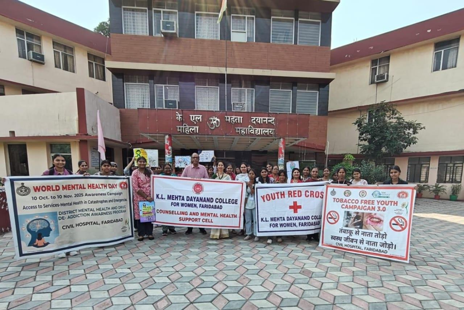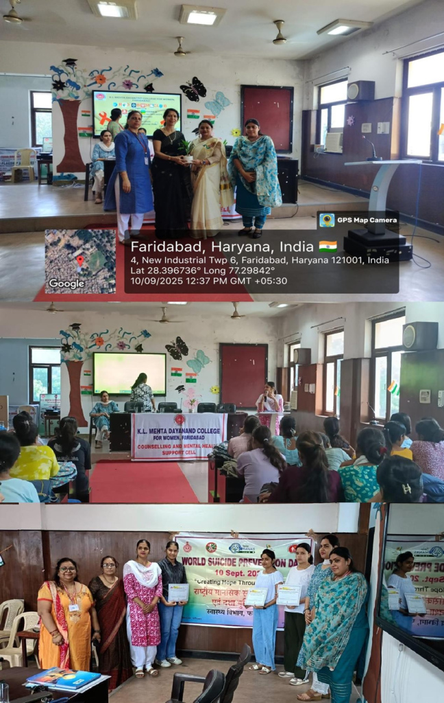 The ‘Counselling and Mental Health Support Cell’ of ‘K.L. Mehta Dayanand College for Women, Faridabad’ in collaboration with ‘B.K.Hospital(Civil Hospital), Faridabad’ organized an awareness session on 10th September 2025 to mark World Suicide Prevention Day and to promote Mental Wellness and Well-Being of Students. The session was facilitated by Ms. Sangeeta Natarajan, Life Skills Trainer and Motivational speaker. She highlighted the importance of overcoming self-limiting beliefs, nurturing a positive mindset, and developing self-confidence to achieve personal and academic goals. Through interactive discussions, she engaged students in reflective activities to understand their strengths and ways to cope with stress effectively. Furthermore, the session was graced by experts from the Mental Health Department, Civil Hospital Faridabad: Ms. Preeti Yadav, Clinical Psychologist, working in the field of suicide prevention and drug de- addiction treatment and Ms. Sumantra, Psychiatric Nursing Officer, specializing in mental health support and awareness. Both the resource persons shared valuable insights on early detection of mental health concerns, stress management, emotional well-being, and the importance of seeking timely professional help. They also highlighted the role of empathy, family support, and community awareness in preventing suicides.Dr. Meenu Dua Ma’am, Principal of the college, appreciated the efforts of the Counselling and Mental Health Support Cell in organizing such meaningful sessions. She emphasized that mental well- being is as important as academic excellence for the holistic development of students. The event was convened by Dr. Veenapani and Ms. Kritika Vaid Outcome: The sessions proved highly beneficial for the students, equipping them with practical strategies to maintain mental wellness, build confidence, and balance emotional health with academic responsibilities.