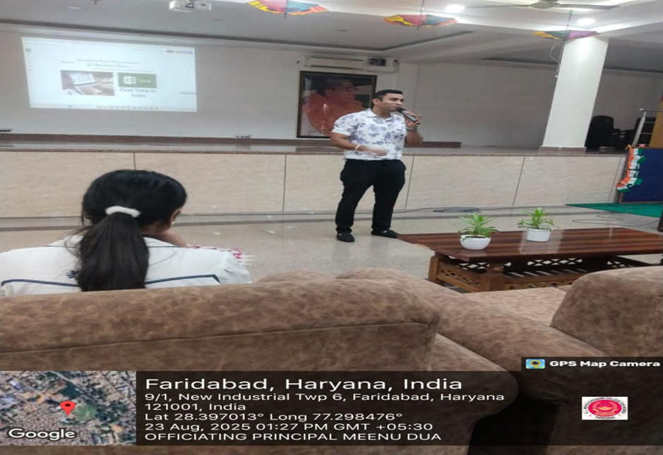8th day of the workshop- Department of Commerce and Management of K.L. Mehta Dayanand College for Women, Faridabad, organise 8th day of the 10-day Days Workshop on ‘Advance Excel Skills’ was organised as an initiative for up skilling students for Career opportunities workshop on was organized by of under the guidance of the Principal Ma’am, Dr. Meenu Dua and IQAC Coordinator, Ms. Amita Dureja on 10 september 2025. The workshop was convened by Dr. Rekha Goel(HOD, Dept. of Commerce and Management) and Dr. Sudesh Kumari. The session was delivered by Mr. Sandeep Arora, a certified SAP and Advance Excel consultant. The workshop aimed to familiarize students with the significance of Advance Excel in data processing and its wide applications in the business world through practical learning. .A total of 100 students attended and benefitted from the session, which concluded with an interactive discussion, leaving students motivated and well-informed.. The programme concluded with words of motivation, inspiring the students to apply their acquired knowledge and skill in real life applications.