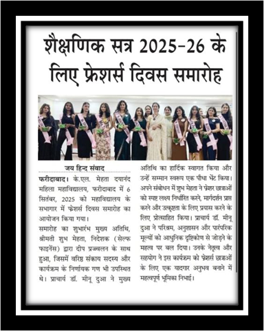 EVENT- ORIENTATION OF RED RIBBON CLUB REPORT (3 September, 2024) Red Ribbon Club of K. L. Mehta Dayanand College for Women, Faridabad organised an orientation programme under the guidance of our Honorable Principal Mam, Dr. Manju Dua on 3rd September 2024 in Seminar hall. The aim of this orientation programme is to educate and get aware our young students about the objectives of the club. During the program, we introduce president, joint president, Secretary and joint Secretary to the members of the club. Dr. Rina Parshad explained about government initiatives regarding healthy life style, proper adult education and drug addiction. Ms. Suman Lata Yadav gave an overview of the club’s objectives, activities and roles & responsibilities of club members. The program was well organised by the conveners ( Dr. Rina Parshad and Ms.Suman Lata Yadav) . Our respected principal ma’am Dr.Manju Dua appreciates students with their motivational words. Number of Members of the Club- 90 STUDENTS President of the Red Ribbon Club: Kajal B.Com. (H) 2nd Year Joint President of The Club: Sakshi B.Com. (C.A) Final Year Secretary of the Club: Ankita B.Com. (C.A) Final Year Joint Secretary of The Club: Tanu B.Com. (H) 2nd Year