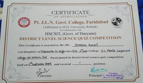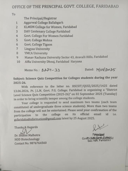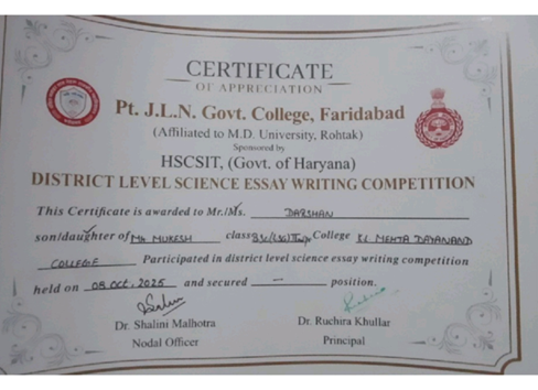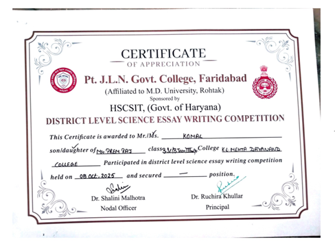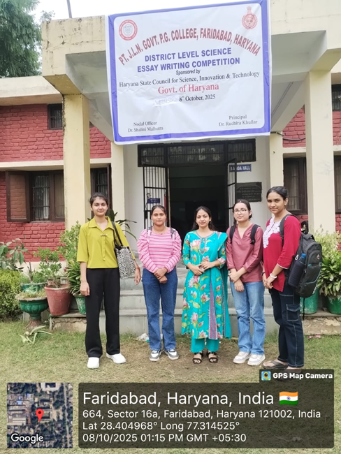 DISTRICT LEVEL ESAAY WRITING COMPETITION A HSCSIT-sponsored District Level Essay Writing Competition was held on 8th October 2025 at Pt. J.L.N. Government College, Faridabad. Four students from the Department of Science of our college enthusiastically participated in the event. These students were accompanied by faculty members – Ms. Reeta Kumari and Ms. Anita Yadav.