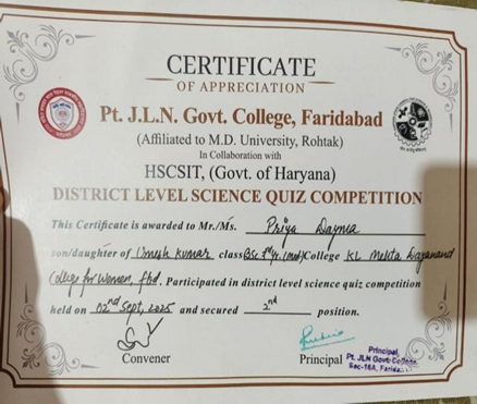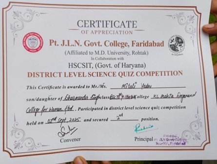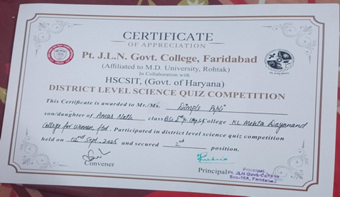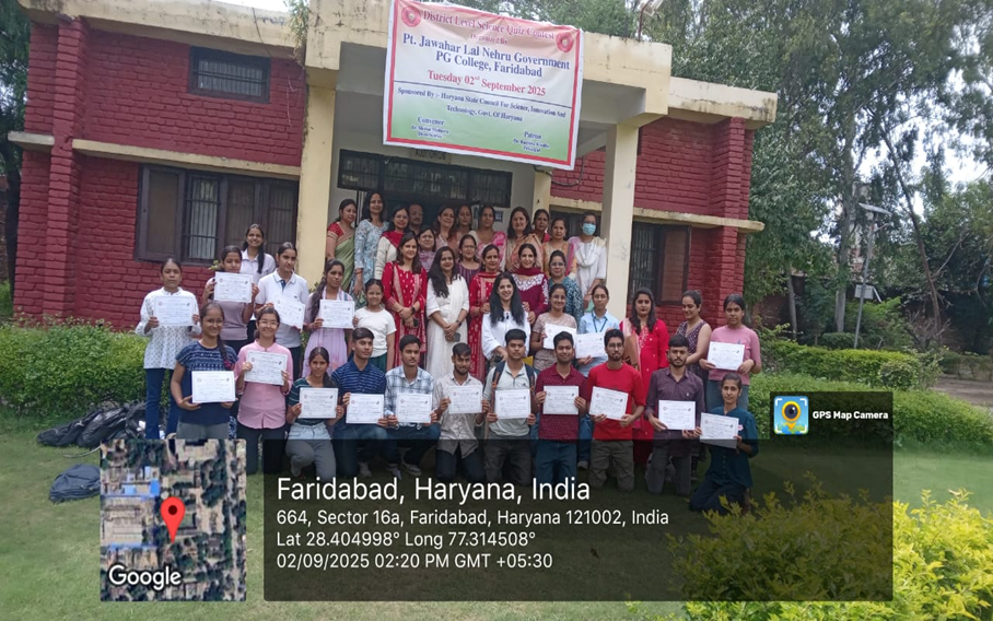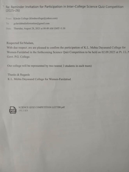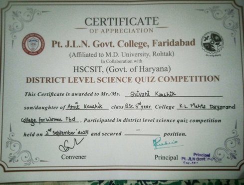 District Level Science Quiz Competition A District Level Science Quiz Competition was organized on 2nd September 2025 at Pt. J.L.N. Government P.G. College, Faridabad. The event witnessed enthusiastic participation from 16 teams representing different colleges of Faridabad. After the screening round, *8 teams qualified* for the finals. The quiz consisted of multiple segments such as general science, rapid-fire, and visual rounds, which tested the participants’ knowledge, logical thinking, and quick response skills.From *K.L. Mehta Dayanand College for Women, Faridabad*, two teams participated in the competition under the guidance of Ms. Manisha and Ms. Sonia Bisht. *Team 1*: Mitali – B.Sc. Biotech (3rd Year) Priya Dayma – B.Sc. Medical (3rd Year) Dimple – B.Sc. Physical Sciences (2nd Year) *Team 2*: Shivani – B.Sc. Biotech (3rd Year) Khushi – B.Sc. Life Sciences (2nd Year) Ameesha – B.Sc. Physical Sciences (2nd Year)