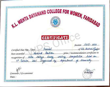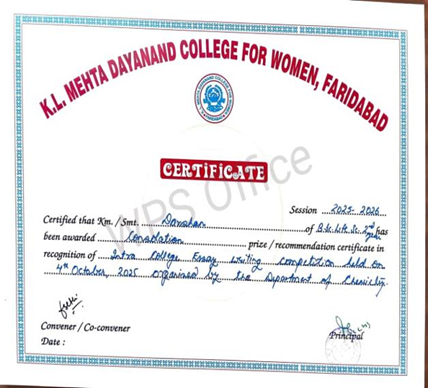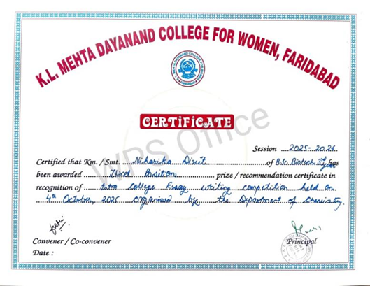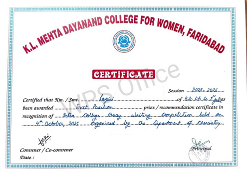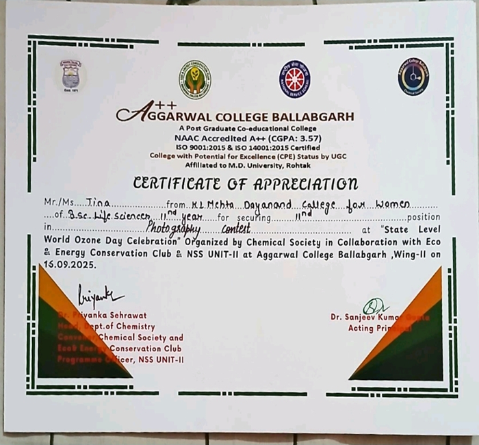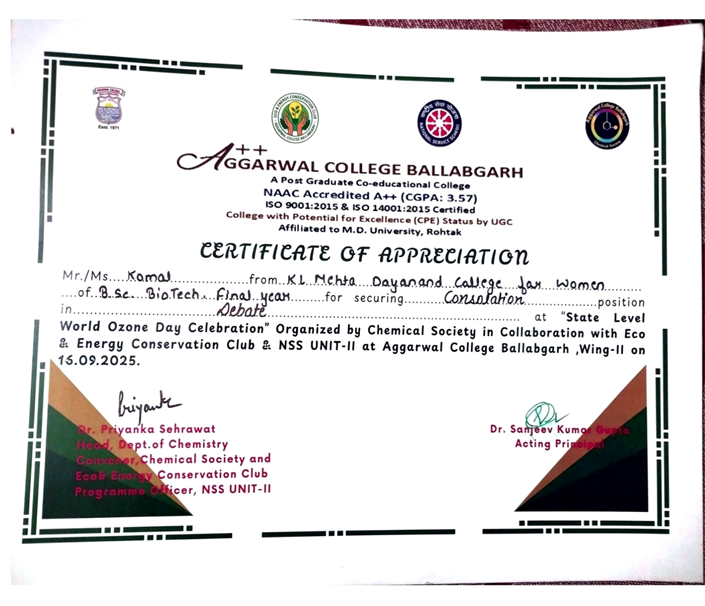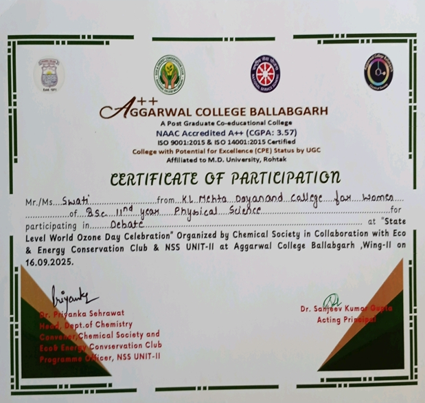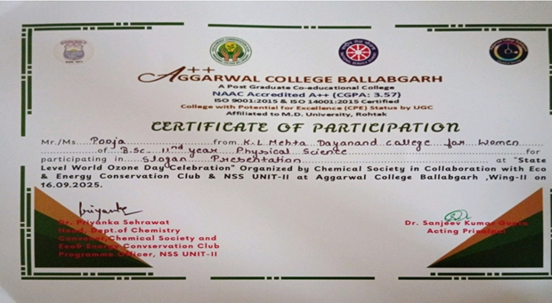 State level world Ozone Day Celebration The students of K.L. Mehta Dayanand College for Women participated at the State Level ‘World Ozone Day Celebration’ held at Aggarwal College, Ballabgarh on 16th September 2025. They competed in multiple categories, including Slogan Writing, Reel Making, Photography, and Debate, and brought laurels to the institution with their outstanding performances. We extend our heartfelt gratitude to our esteemed Principal Dr. Meenu Dua for her unwavering support, which has been instrumental in facilitating such endeavours. Additionally, we express our sincere appreciation to Dr. Beena Sethi (H.O.D. of Science) for her continuous encouragement and invaluable guidance.