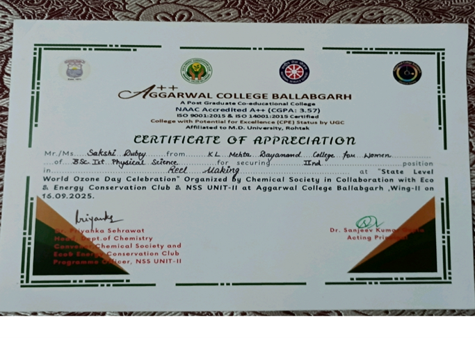 Achievements: *Reel Making – Sakshi Dubey (B.Sc. Physical Science 1st yr.) secured 2nd position, winning the prestigious certificate with a cash prize of ₹400 for her impactful performance.* *Photography – Tina Thapa (B.Sc. Life Science 2nd yr.) secured 2nd position, winning the prestigious certificate with a cash prize of ₹400 for her impactful performance.* *Debate – Komal (B.Sc. Biotech 3rd yr.) received a consolation prize.* The event provided an excellent platform for students to exhibit their skills and interact with fellow participants from various institutions. The dedication and guidance of Ms. Rajni, Ms. Shivani Gandhi, and Ms. Garima Mehta played a crucial role in the students’ success. The faculty and fellow students of K.L. Mehta Dayanand College for Women extend heartfelt congratulations to all the participants and winners for their remarkable achievements. Their triumph at the State Level ‘World Ozone Day Celebration’ 2025 stands as a testament to their hard work, passion, and commitment to excellence.