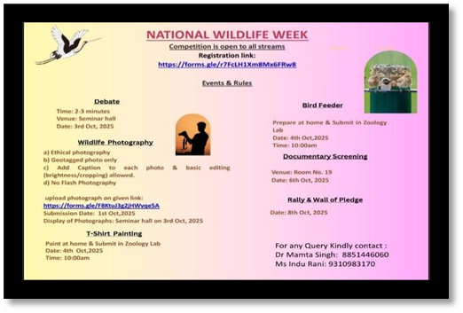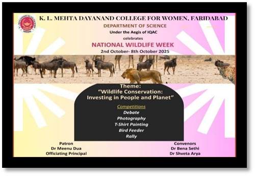 National Wildlife Week Celebration (2nd–8th October 2025) Theme: “Wildlife Conservation: Investing in People and Planet” The Department of Science, K.L. Mehta Dayanand College for Women, Faridabad, celebrated *National Wildlife Week* from *2nd to 8th October 2025* with great enthusiasm and commitment. The celebration was organized around the theme *“Wildlife Conservation: Investing in People and Planet,”* with the objective of promoting awareness about biodiversity conservation and inspiring students to contribute towards a sustainable future. Inaugural Day and Competitions (3rd October 2025) The week-long celebration commenced with the lamp-lighting ceremony, symbolising wisdom, knowledge, and harmony with nature. On 3rd October 2025, Debate and Photography Competitions were held, witnessing enthusiastic participation from students across various streams. In the Debate Competition, students presented insightful views on issues related to wildlife conservation, showcasing their awareness and responsibility towards protecting biodiversity. Winners (Debate Competition): * 🥇 1st Prize:Saloni (B.Com. Final Year) * 🥈 2nd Prize: Nikita and Mitali (B.Sc. Biotechnology Final Year) * 🥉 3rd Prize: Devismita (B.Com. (H) Final Year) * 🎖️ Consolation Prize:Divya (B.Sc. Biotechnology 1st Year)