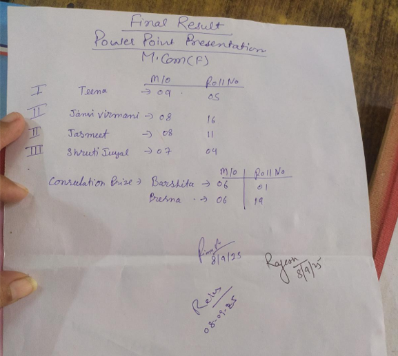 The judges for the events were Dr. Meenu Dua(HOD Science), Dr. Sangeeta Kulshrestha (Associate professor, Department of Home science) and Ms. Sujata( Assistant professor, Department of Home science). The whole event was successfully organised under the able guidance of Principal mam, Dr. Manju Dua and the convener of the event, Dr. Meenu Dua (HOD, Department of Science).