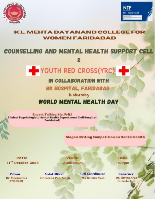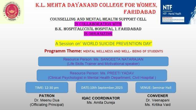 Counselling and Mental Health Support Cell in collaboration with ‘B.K.Hospital(Civil Hospital), Faridabad’ organized an awareness session on 10th September 2025 to mark World Suicide Prevention Day