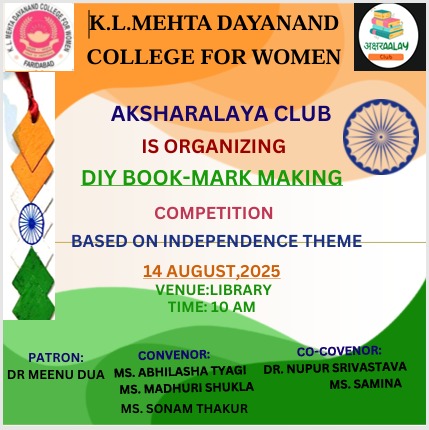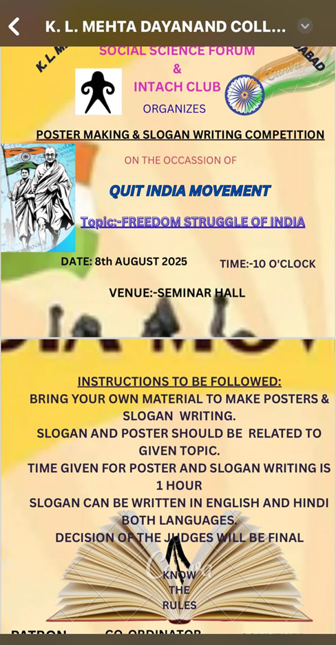 के.एल. मेहता दयानंद महिला महाविद्यालय में सामाजिक विज्ञान मंच तथा इंटेक क्लब केतत्वावधान में भारत छोड़ो आंदोलन की स्मृति में 08 अगस्त 2025 को सेमिनार हॉल में पोस्टर निर्माणएवं नारा लेखन प्रतियोगिता का आयोजन किया गया।
