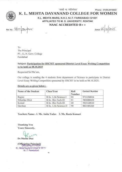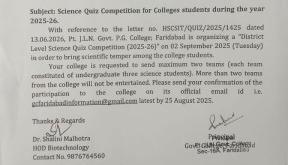 District Level Science Quiz Competition was organized on 2nd September 2025 at Pt. J.L.N. Government P.G. College, Faridabad in which two teams participated in the competition and Team 1 secured the Second Position .