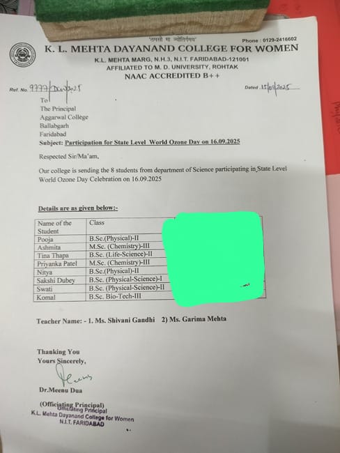 Students of our college participated at the State Level ‘World Ozone Day Celebration’ held at Aggarwal College, Ballabgarh on 16th September 2025 in which Sakshi Dubey (B.Sc. Physical Science 1st yr.) secured 2nd position in Reel making, Tina Thapa (B.Sc. Life Science 2nd yr.) secured 2nd position in Photography, Komal (B.Sc. Biotech 3rd yr.) received a consolation prize in Debate.