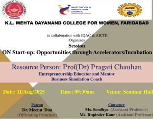 K.L. Mehta Dayanand College for Women, Faridabad, under the aegis of IQAC and AICTE organized an One-Day Workshop on Effective Sales and Marketing Strategy for Young Entrepreneurs for BBA studentson February 24, 2025