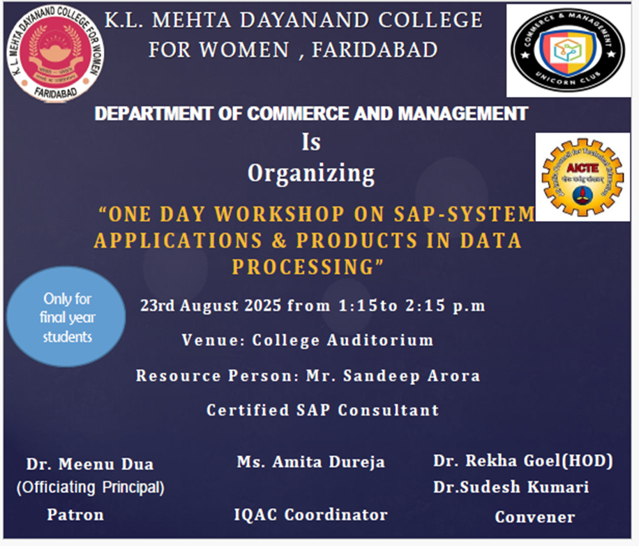 A one-day workshop on SAP (System Applications and Products in Data Processing) was organized by the Department of Commerce and Management on 23rd August 2025. The session was delivered by Mr. Sandeep Arora, a certified SAP consultant.